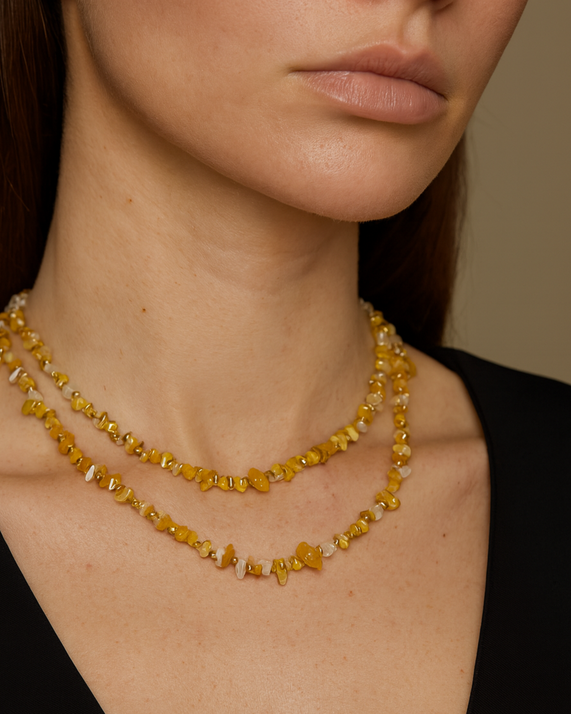 This set includes a necklace and bracelet. It's crafted from yellow crushed stones beads and 18-karat gold plating in a timeless design.